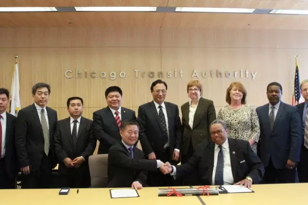 美國當地時間2016年4月15日,中國中車與芝加哥交通管理局(CTA)在美國芝加哥就856輛地鐵車輛項目舉行了簽約儀式。中國中車集團公司、股份公司董事長崔殿國與中國中車股份公司副總裁余衛平見證了簽約儀式。具體負責該項目的中國中車四方股份公司總經理馬云雙與芝加哥交通管理局總裁卡特在項目上簽字。美國當地時間2016年4月15日,中國中車與芝加哥交通管理局(CTA)在美國芝加哥就856輛地鐵車輛項目舉行了簽約儀式。中國中車集團公司、股份公司董事長崔殿國與中國中車股份公司副總裁余衛平見證了簽約儀式。具體負責該項目的中國中車四方股份公司總經理馬云雙與芝加哥交通管理局總裁卡特在項目上簽字。